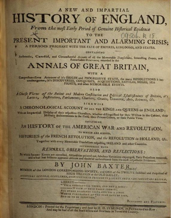 The American and French revolutions changed public perceptions of Ball dramatically. Ball was still used as figure of terror by opponents of revolution (e.g., Edmund Burke) but this was partly because of the changing perceptions about Ball. From the 1790s onwards, Ball was more likely to be cast in heroic and even saintly terms by radicals, later socialists, and some liberals. John Baxter—silversmith, one-time chair of the London Corresponding Society, and founder member of the Friends of Liberty—wrote A New and Impartial History of England, from the Most Early Period of Genuine Historical Evidence to the Present Important and Alarming Crisis (1796) which was dependent on those that came before him but changed the value judgments on Ball and the rebels. Ball was no longer the seditious priest but a champion of ancient English rights and preached against the ‘tyranny of artificial distinctions.’