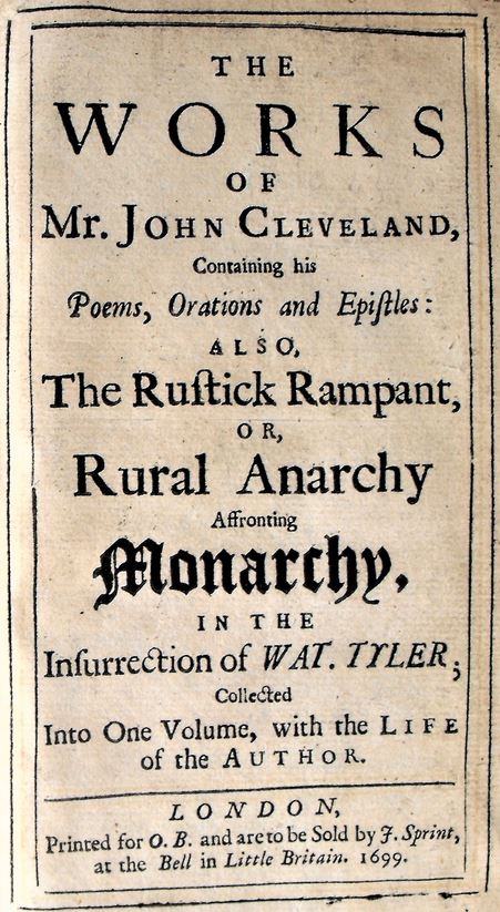 The polemics against Ball were taken up in the English civil wars/revolution of the seventeenth century. There isn’t much evidence to suggest Ball’s memory was used in the more radical circles of the seventeenth century, even if similar ideas were. Ball instead continued to be used polemically by royalists, seen a precursor to revolutionary action. He was even occasionally used by opponents of the royalists to make a similar point—you are the ones more in line with chaos and disorder. Probably the most polemical treatment of Ball and 1381 in the entire 640-year history of reception is The Idol of the Clownes, or, Insurrection of Wat the Tyler, with His Priests Baal and Straw (1654, available here), attributed to the anti-puritan royalist John Cleveland (later editions were under the title, The Rustick Rampant, or Rural Anarchy affronting Monarchy). The following gives some indication of this: