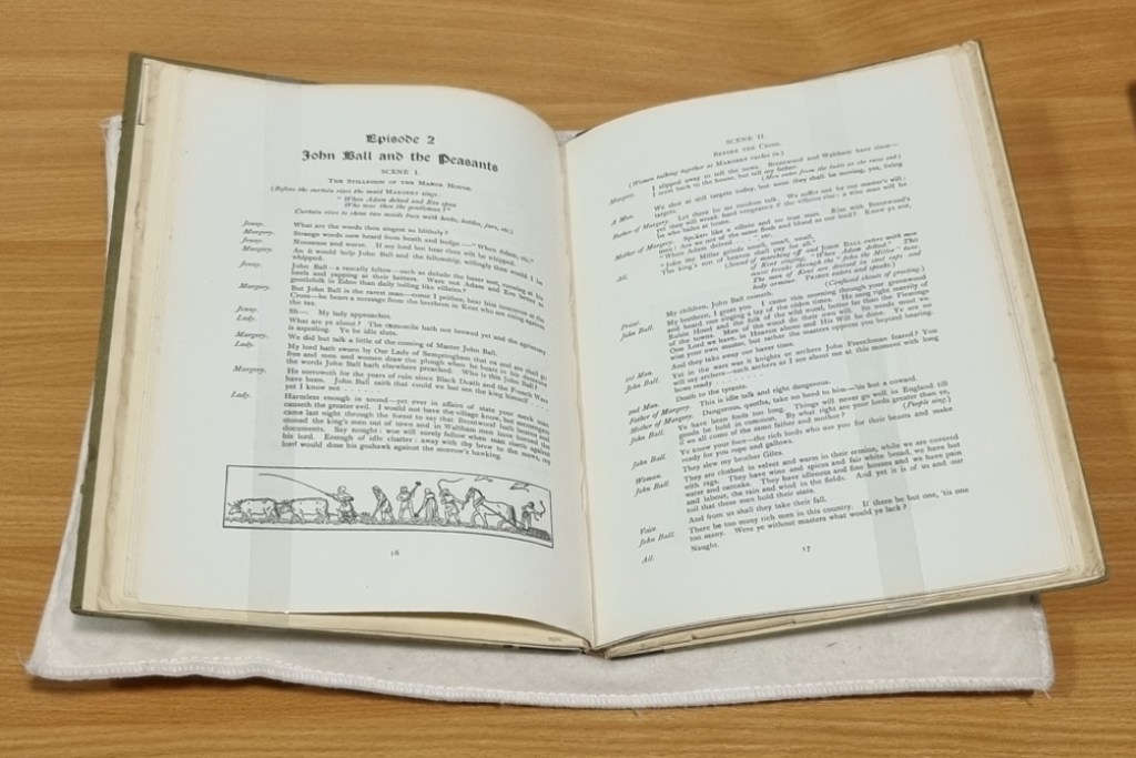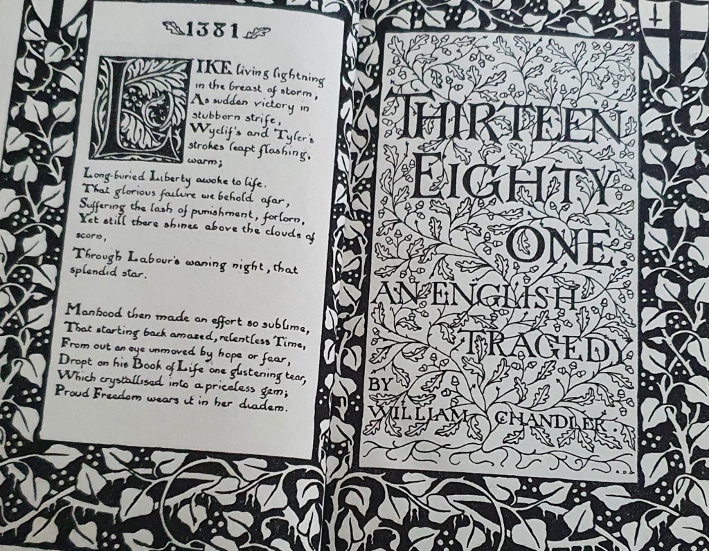 Morris’ influence continued well beyond the First World War, both in terms of explaining Ball as a potentially socialist ‘prophet’ and ‘martyr’ and his famed aesthetics. William Chandler’s play Thirteen Eighty One: An English Tragedy (1927) (dedicated to Morris) provides a clear visual example: