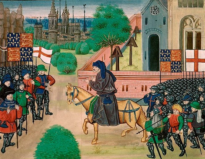 The most famous and influential visual portrayal is from the illuminated Froissart manuscript (c. 1460–1480), featuring ‘Jehan Balle’ and the rebels with the banner of St George (British Library MS Royal 18 E. I f.165v).